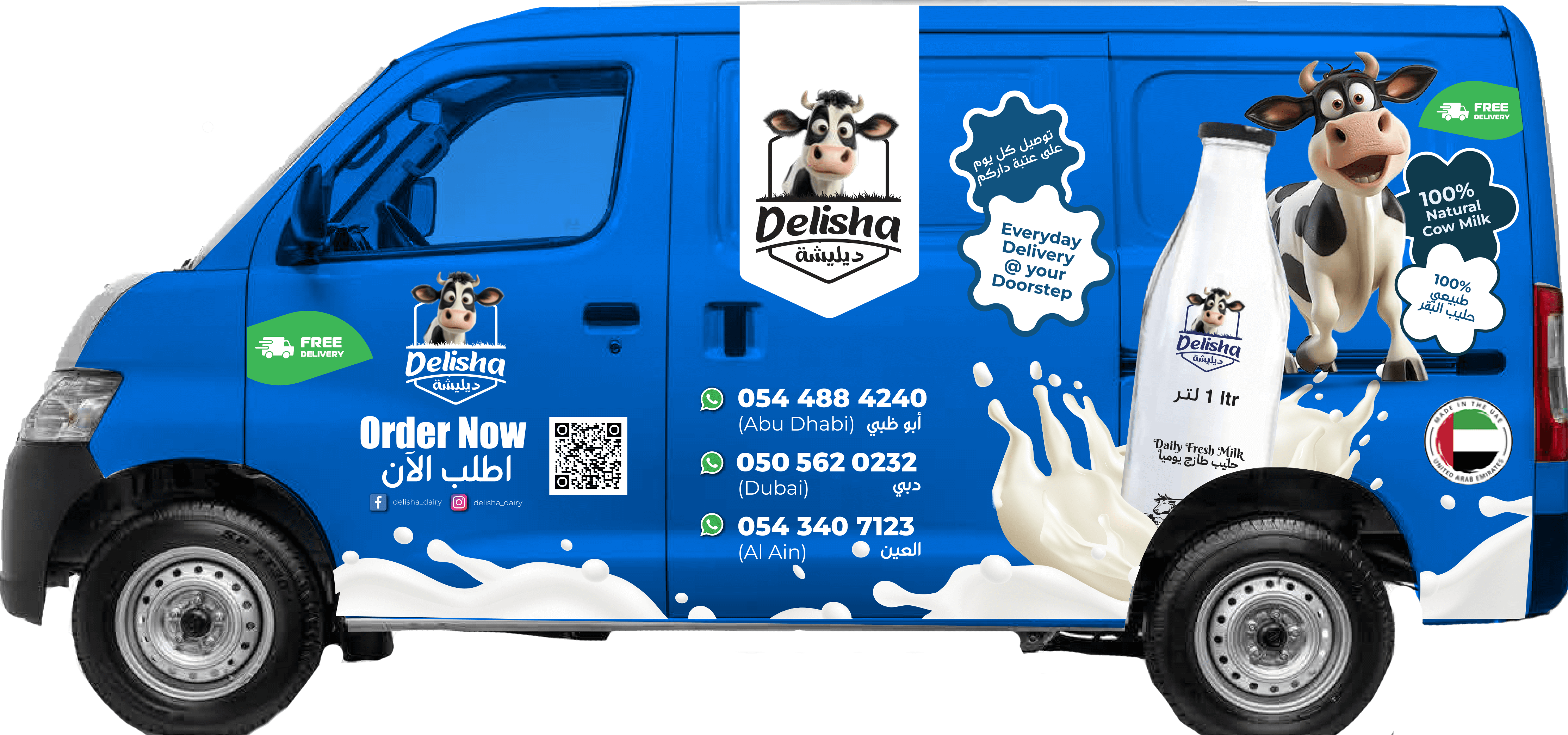 حليبنا 100% طبيعي، يُجمع يوميًا من مزارع موثوقة في الإمارات ويُوصل إلى باب منزلك بدون أي مواد حافظة.